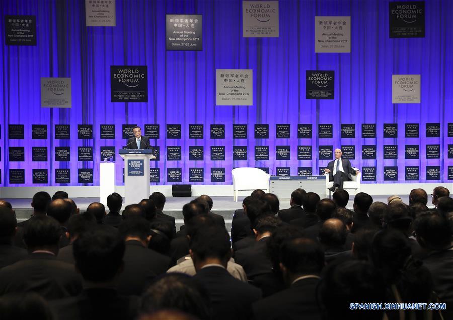 El primer ministro, Li Keqiang pronuncia un discurso en la ceremonia inaugural de la Reunión Anual de Nuevos Campeones 2017, también conocida como el Foro Davos de Verano, en la ciudad costera china de Dalian, en el noreste del país.(Xinhua/Pang Xinglei)