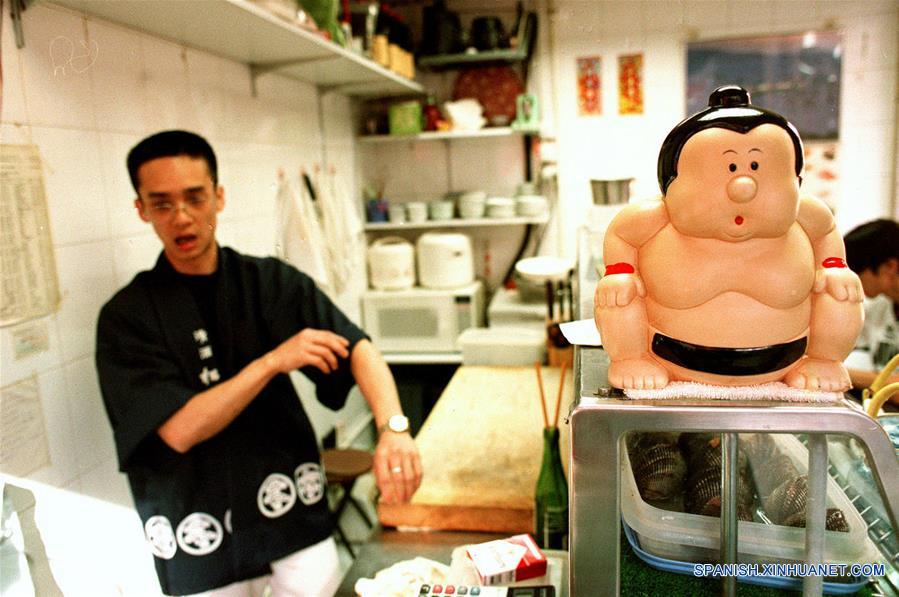 Imagen de archivo del 28 de mayo de 1997 de Poon Chuen Wah, trabajando en su restaurante de sushi, en Hong Kong, en el sur de China. Esta serie de imágenes de archivo muestran la vida cotidiana de los residentes de Hong Kong en el a?o de 1997. El 1 de julio marca el 20 aniversario del regreso de Hong Kong a China. (Xinhua/Chen Xiaobo)