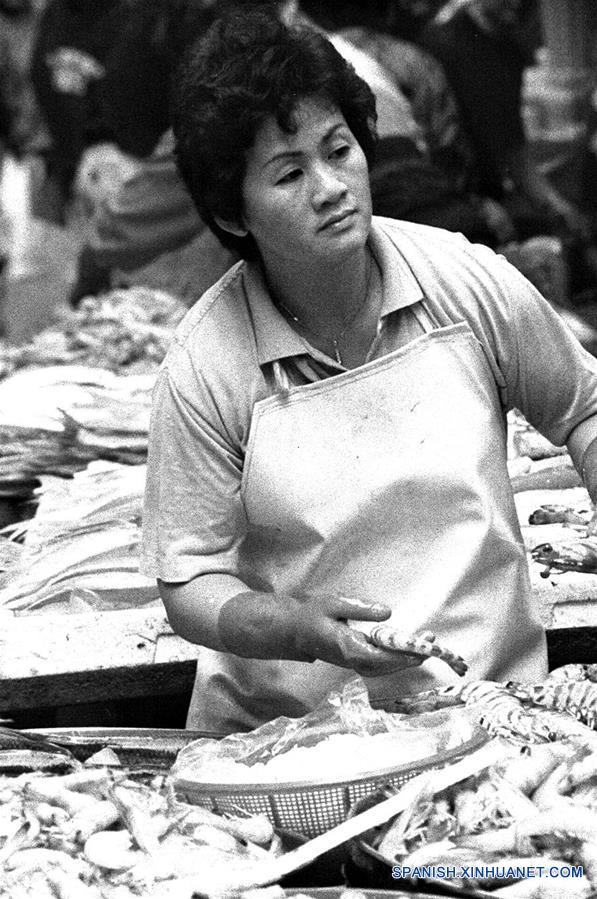 Imagen de archivo del 6 de febrero de 1997 de una vendedora de pescado trabajando en su puesto en un mercado en Hong Kong, en el sur de China. Esta serie de imágenes de archivo muestran la vida cotidiana de los residentes de Hong Kong en el a?o de 1997. El 1 de julio marca el 20 aniversario del regreso de Hong Kong a China. (Xinhua/Chen Xiaobo)