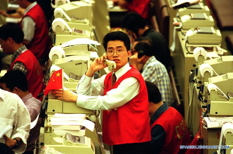 Imagen de archivo del 27 de junio de 1997 de un comerciante recibiendo una llamada durante el último día de comercio previo al regreso de Hong Kong a China, en la Casa de Bolsa de Hong Kong, en Hong Kong, en el sur de China. Esta serie de imágenes de archivo muestran la vida cotidiana de los residentes de Hong Kong en el a?o de 1997. El 1 de julio marca el 20 aniversario del regreso de Hong Kong a China. (Xinhua/Zhang Yanhui) (rtg)