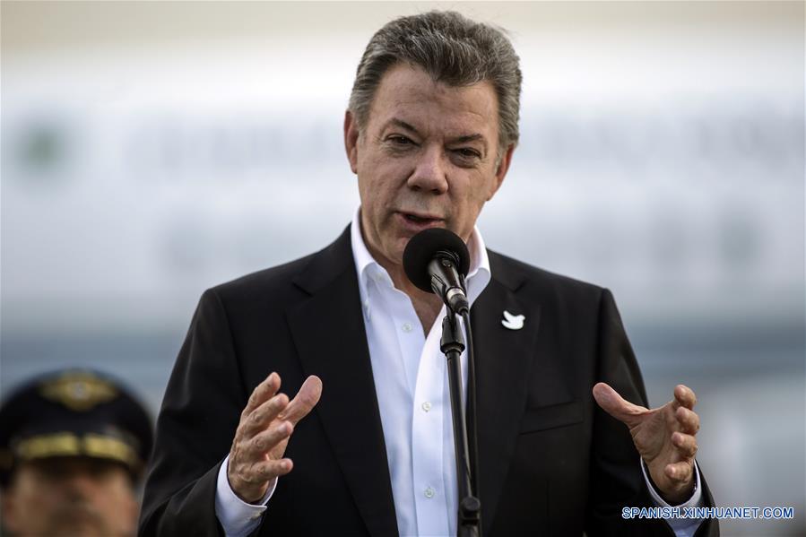 CALI, junio 29, 2017 (Xinhua) -- El presidente colombiano, Juan Manuel Santos, pronuncia un discurso a su llegada para participar en la XII Cumbre de la Alianza del Pacífico (AP), en el aeropuerto Alfonso Bonilla Aragón, en la ciudad de Cali, Colombia, el 29 de junio de 2017. El presidente colombiano, Juan Manuel Santos, afirmó el jueves que en la XII Cumbre de la Alianza del Pacífico se darán pasos importantes para cumplir con los objetivos del bloque comercial. "Para Colombia es un verdadero honor y un privilegio ser anfitrión de esta Cumbre de la Alianza del Pacífico", dijo el mandatario tras arribar a la ciudad de Cali para reunirse con sus homólogos de Chile, Michelle Bachelet; México, Enrique Pe?a Nieto, y Perú, Pedro Pablo Kuczynski. (Xinhua/Jhon Paz)