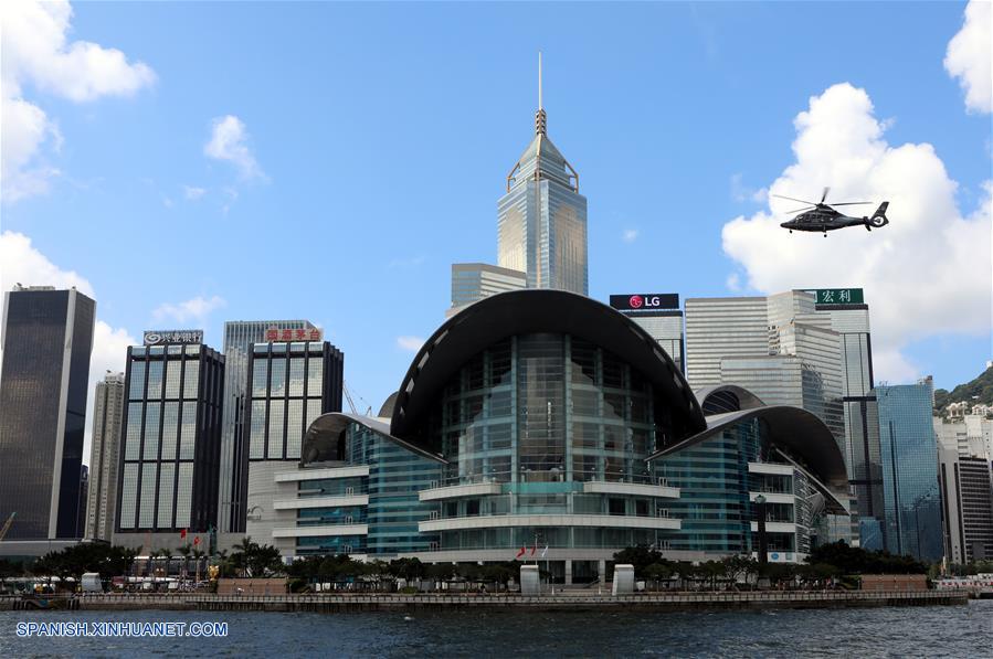 Imagen del 10 de junio de 2017 de un helicóptero patrullando sobre el Centro de Convenciones y Exposiciones de Hong Kong, en Hong Kong, en el sur de China. (Xinhua/Li Peng)