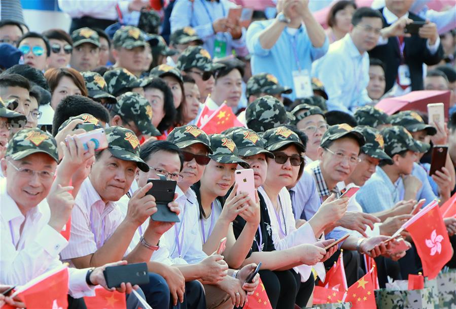 HONG KONG, junio 30, 2017 (Xinhua) -- Espectadores observan el evento de inspección de la guarnición del Ejército Popular de Liberación (EPL) en la Región Administrativa Especial de Hong Kong, en las barracas de Shek Kong, en Hong Kong, en el sur de China, el 30 de junio de 2017. El presidente de China, Xi Jinping, también secretario general del Comité Central del Partido Comunista de China y presidente de la Comisión Militar Central, inspeccionó el viernes la guarnición del Ejército Popular de Liberación (EPL) en la Región Administrativa Especial de Hong Kong, en las barracas de Shek Kong. (Xinhua/Li Gang)