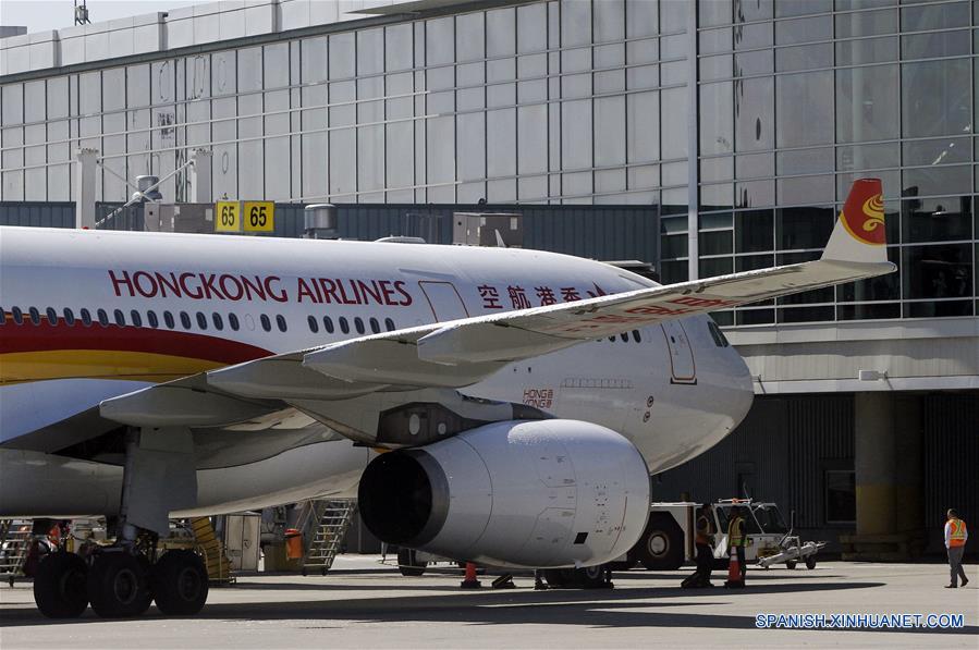 Imagen del 30 de junio de 2017 de un avión de Hong Kong Airlines de China permaneciendo en el Aeropuerto Internacional de Vancouver, en Vancouver, Canadá. El Aeropuerto Internacional de Vancouver recibió el viernes por la ma?ana su primer vuelo norteamericano de la aerolínea Hong Kong Airlines de China. (Xinhua/Liang Sen)