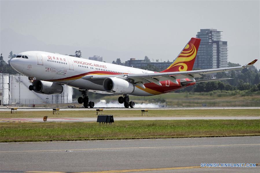 Imagen del 30 de junio de 2017 de un avión de Hong Kong Airlines de China llegando al Aeropuerto Internacional de Vancouver, en Vancouver, Canadá. El Aeropuerto Internacional de Vancouver recibió el viernes por la ma?ana su primer vuelo norteamericano de la aerolínea Hong Kong Airlines de China. (Xinhua/Liang Sen)