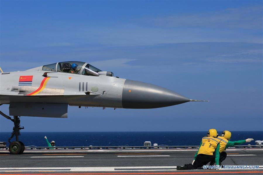 A BORDO DEL PORTAAVIONES LIAONING, julio 3, 2017 (Xinhua) -- Imagen del 1 de julio de 2017, de un caza J-15 despegando del portaaviones Liaoning. Una flotilla, incluyendo el portaaviones Liaoning, ha estado llevando a cabo un entrenamiento trans-regional desde que salió de Qingdao, en el este de China, el 25 de junio. (Xinhua/Zeng Tao)