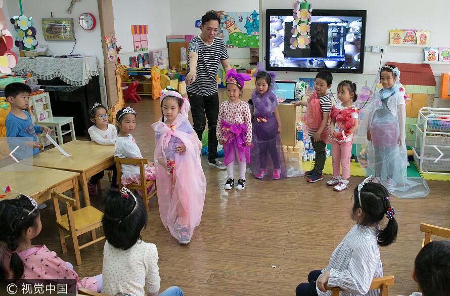 Mantou y sus compa?eros de guardería desfilaron la ropa que ellos mismos hicieron después de que Qian Xiaofeng les ense?ara en Shanghai, el 23 de mayo. [Foto / VCG]