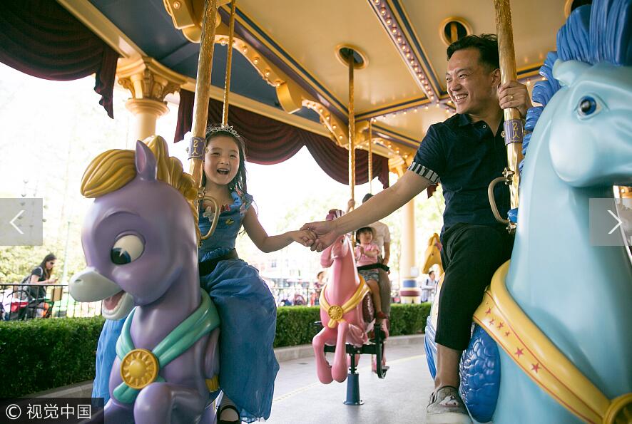 Mantou y su padre montan en carrusel en el parque Disney de Shanghai, el 21 de mayo de 2017. [Foto / VCG]