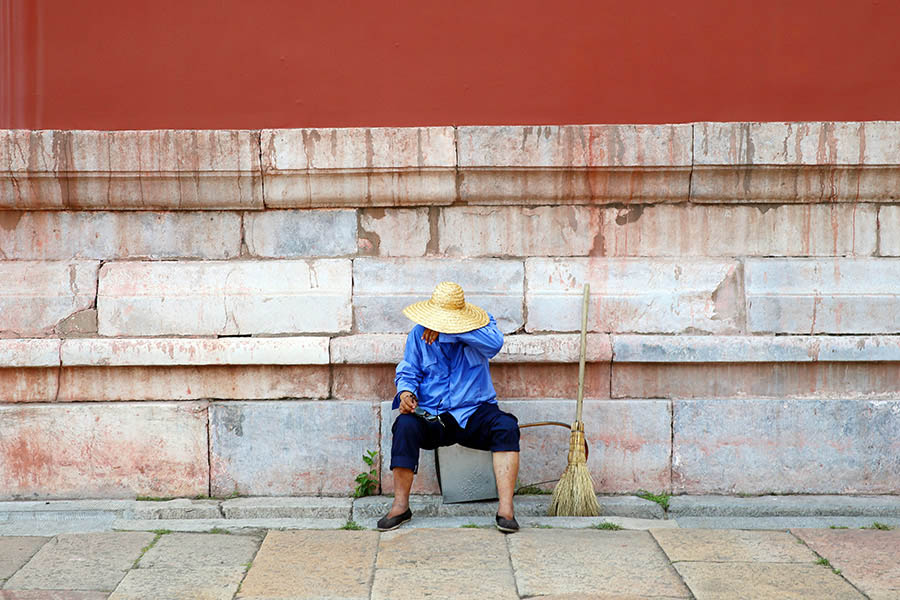 Un trabajador se servicio público de limpieza se seca el sudor de la frente en el Museo del Palacio de Pekín, el 12 de julio de 2017. [Foto / Xinhua]