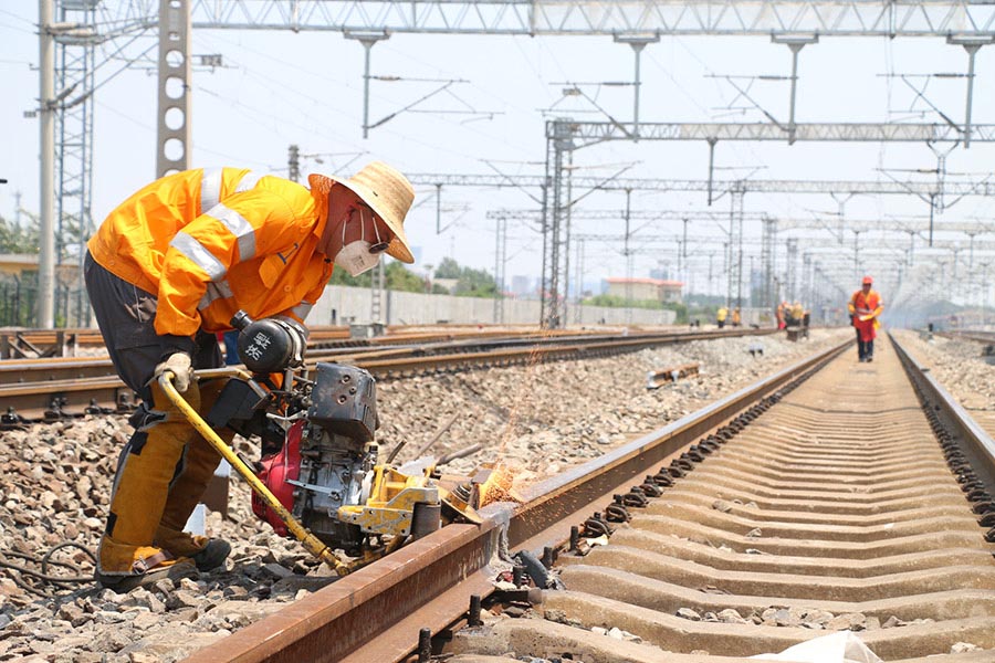 Un trabajador de sistema de ferrocarriles arregla las vías en la estación de tren de Yancheng, provincia de Shandong, el 12 de julio de 2017. [Foto / Xinhua]