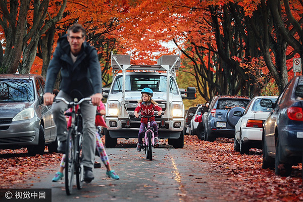 Dos ciclistas pedalean por Vancouver, Canadá. [Foto: VCG]