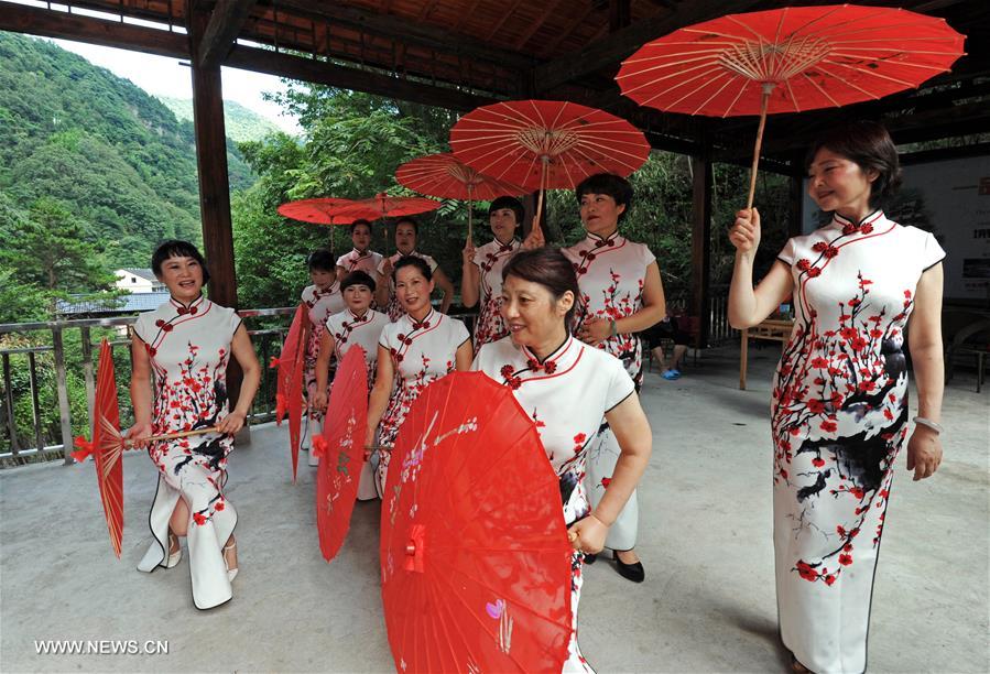 ZhuYueling (primera izquierda) ense?a a los turistas el espectáculo del cheongsam en la aldea de Baisha de Lin'an, provincia china de Zhejiang, el 20 de julio de 2017. Con una temperatura media de 26 grados en verano, la aldea Baisha de Lin'an se ha convertido en un popular destino turístico en la provincia. En los últimos a?os, el turismo rural se ha desarrollado dramáticamente en Baisha, para el que ha sido necesario el 90% de la mano de obra local. (Xinhua / Tan Jin)