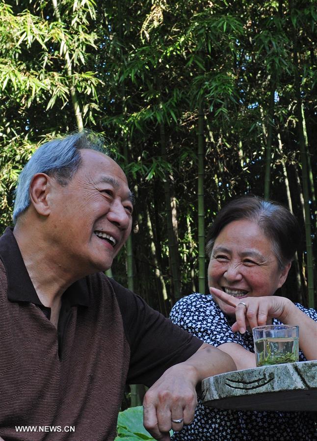 El turista Li Zhiyu y su esposa Hong Rongcharlanen la aldea de Baisha de Lin'an, provincia china de Zhejiang, el 20 de julio de 2017. Con una temperatura media de 26 grados en verano, la aldea Baisha de Lin'an se ha convertido en un popular destino turístico en la provincia. En los últimos a?os, el turismo rural se ha desarrollado dramáticamente en Baisha, para el que ha sido necesario el 90% de la mano de obra local. (Xinhua / Tan Jin)