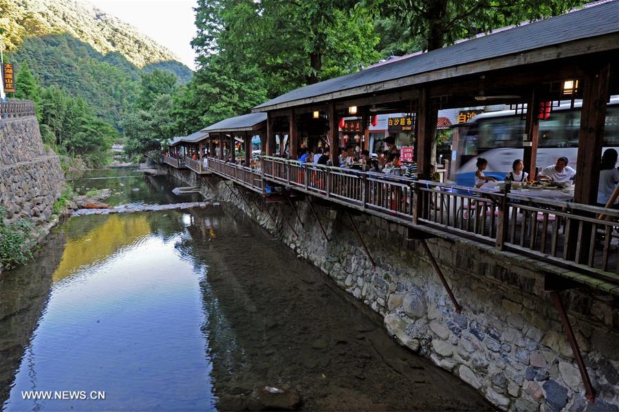 Los turistas disfrutan de su almuerzo en la aldea de Baisha de Lin'an, provincia china de Zhejiang, el 20 de julio de 2017. Con una temperatura media de 26 grados en verano, la aldea Baisha de Lin'an se ha convertido en un popular destino turístico en la provincia. En los últimos a?os, el turismo rural se ha desarrollado dramáticamente en Baisha, para el que ha sido necesario el 90% de la mano de obra local. (Xinhua / Tan Jin)