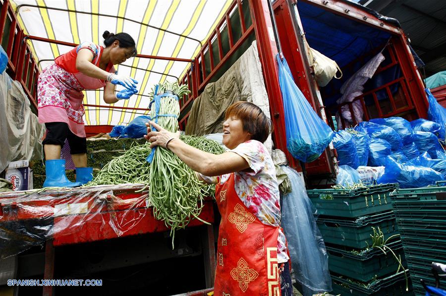 SHANGHAI, julio 25, 2017 (Xinhua) -- Trabajadores descargan caupí en el mercado al por mayor Jiangqiao, en Shanghai, en el este de China, el 25 de julio de 2017. Una alerta roja por altas temperaturas fue emitida el martes por el Observatorio Meteorológico Central de Shanghai cuando se pronostica que la temperatura alcance los 40 grados centígrados en las siguientes 24 horas. (Xinhua/Fang Zhe)