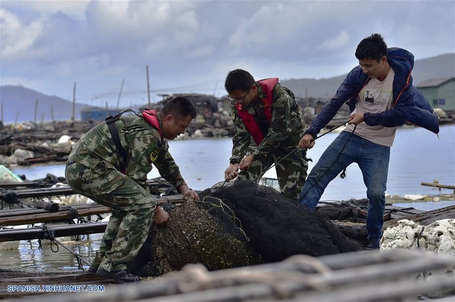 FUJIAN, julio 29, 2017 (Xinhua) -- Soldados ayudan a los pescadores a empacar las redes de pesca mientras se preparan para evitar da?os antes de que el tifón Nesat toque tierra, en la ciudad de Ningde de la provincia de Fujian, en el sureste de China, el 29 de julio de 2017. Más de 3,100 personas han sido evacuadas en la provincia suroriental china de Fujian en previsión de la llegada del tifón Nesat. (Xinhua/Yuan Ziyou)