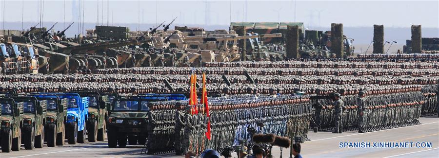 MONGOLIA INTERIOR, julio 30, 2017 (Xinhua) -- Un desfile militar es llevado a cabo para conmemorar el 90 aniversario de la fundación del Ejército Popular de Liberación (EPL), en la base de entrenamiento de Zhurihe, en la Región Autónoma de Mongolia Interior, en el norte de China, el 30 de julio de 2017. El presidente de China, Xi Jinping, también secretario general del Comité Central del Partido Comunista de China (PCCh) y presidente de la Comisión Militar Central, inspeccionará a las tropas y pronunciará un importante discurso. (Xinhua/Zha Chunming)