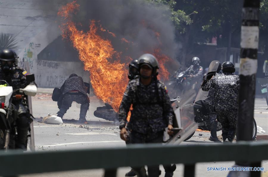 CARACAS, julio 30, 2017 (Xinhua) -- Manifestantes queman una motocicleta durante una protesta en rechazo a la Asamblea Nacional Constituyente (ANC), en Caracas, Venezuela, el 30 de julio de 2017. Otras dos personas fallecidas fueron confirmadas el domingo por la Fiscalía de Venezuela, con lo cual se eleva a 118 el número de víctimas fatales en el marco de las manifestaciones opositoras. El Ministerio Público (MP) informó de la muerte de dos adolescentes de 17 y 13 a?os, en el estado Táchira, ambas por disparos de armas de fuego durante protestas paralelas a las elecciones para la ANC. (Xinhua/Francisco Bruzco)