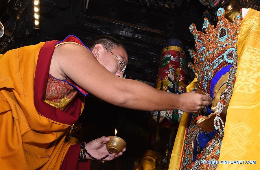 LHASA, julio 30, 2017 (Xinhua) -- Imagen del 27 de julio de 2017, del XI Panchen Lama Bainqen Erdini Qoigyijabu rindiendo homenaje a la estatua de tama?o natural de Buda Sakyamuni a la edad de 12 a?os, en el Templo de Jokhang en Lhasa, capital de la región autónoma del Tíbet, en el suroeste de China. El Panchen Lama realizó una serie de servicios budistas en Lhasa durante los últimos días. (Xinhua/Chogo)
