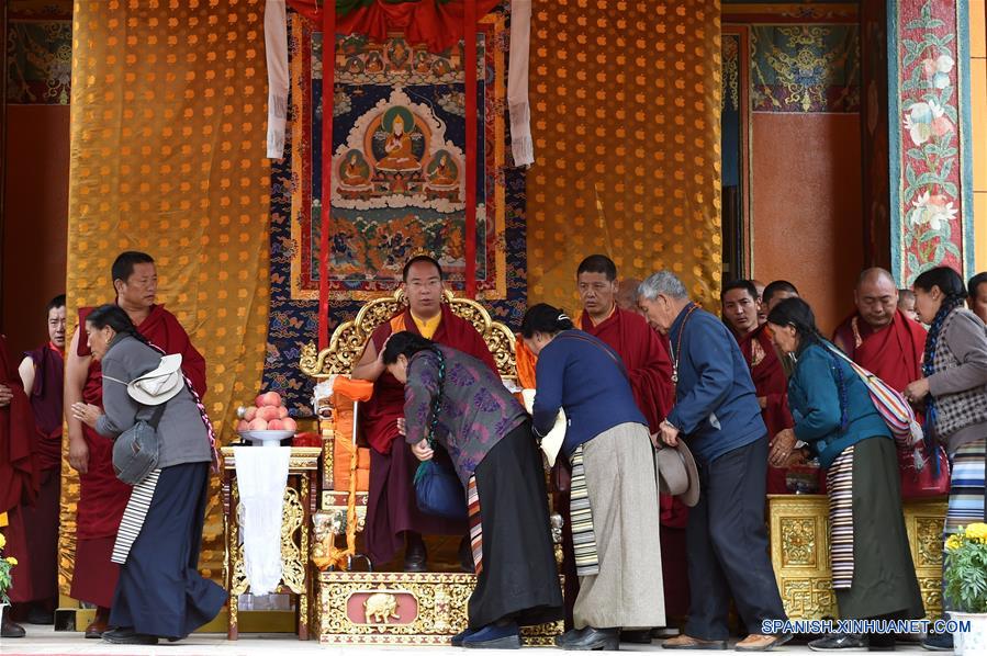 LHASA, julio 30, 2017 (Xinhua) -- El XI Panchen Lama Bainqen Erdini Qoigyijabu realiza un ritual de tocar cabezas para budistas en Lhasa, capital de la región autónoma del Tíbet, en el suroeste de China, el 30 de julio de 2017. El Panchen Lama realizó una serie de servicios budistas en Lhasa durante los últimos días. (Xinhua/Chogo)