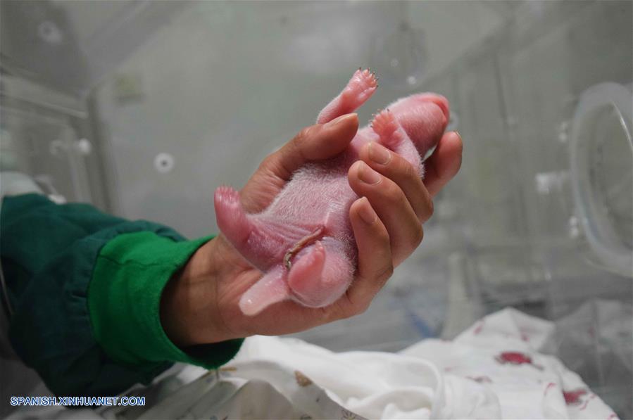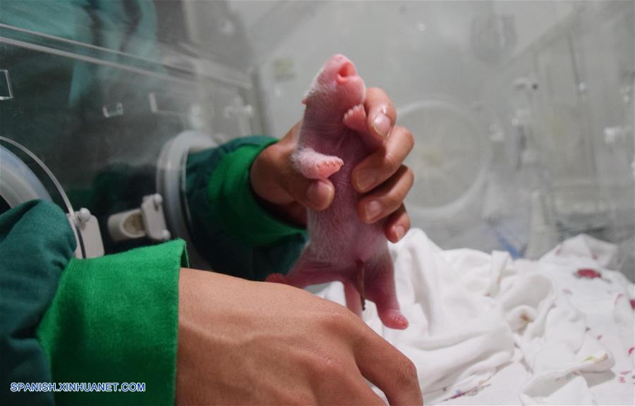 Imagen del 31 de julio de 2017 del primer cachorro de panda gigante nacido de madre en cautiverio y de padre silvestre en la provincia de Sichuan, en el suroeste de China.(Xinhua/Str)