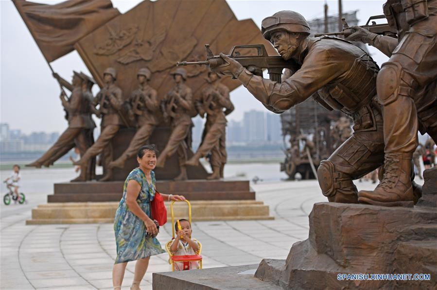 NANCHANG, julio 31, 2017 (Xinhua) -- Vista de esculturas que conmemoran el 90 aniversario de la fundación del Ejército Popular de Liberación (EPL), en una plaza en Nanchang, en la provincia de Jiangxi, en el este de China, el 31 de julio de 2017. La plaza de las esculturas, cubrendo una zona de 16,000 metros cuadrados, fue abierta el lunes al público. (Xinhua/Wan Xiang)