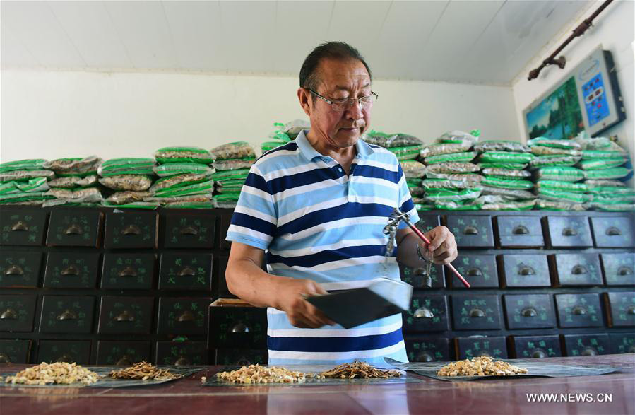 Yue Ruhua selecciona la medicina para sus pacientes en la aldea Dakouqin de Houtuanshan, en la ciudad de Jilin, provincia de Jilin, el 31 de julio de 2017. [Foto / Xinhua]