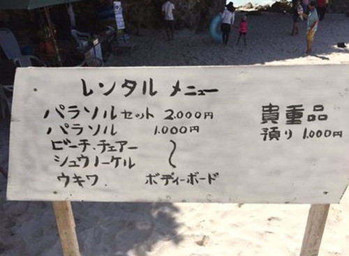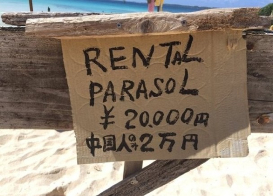 Según la asociación local de turismo, alquilar una sombrilla debe costar unos 2.000 yenes. Sin embargo, los turistas encontraron un cartel de papel en la playa que decía: "ALQUILER DE SOMBRILLAS, 20,000 YENES PARA TURISTAS CHINOS"