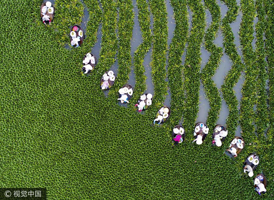 Los aldeanos recogen lotos en la ciudad de Taizhou, provincia de Jiangsu, el 6 de agosto de 2017. Los lotos son plantas acuáticas que crecen en agua de corriente lentade hasta 5 metros de profundidad. [Foto / VCG]