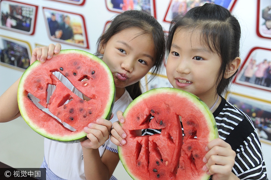 Dos ni?as posan con trozos sandías talladas en los caracteres chinos li qiu, que marcan el comienzo del oto?o en el calendario chino tradicional, en Hefei capital de la provincia de Anhui, el 6 de agosto de 2017. Liqiu este a?o comienza el 7 de agosto. [Foto / VCG]