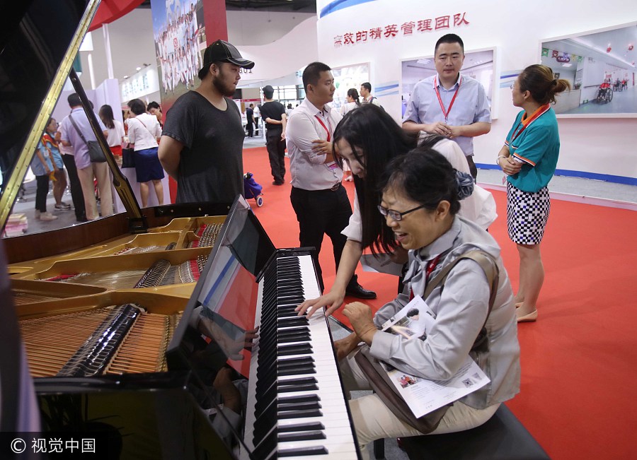 Una visitante mayor aprende a tocar el piano inteligente en la VI Expo Internacional de Servicios para Personas Mayores de China en Beijing, el 4 de agosto de 2017. [Foto / VCG]