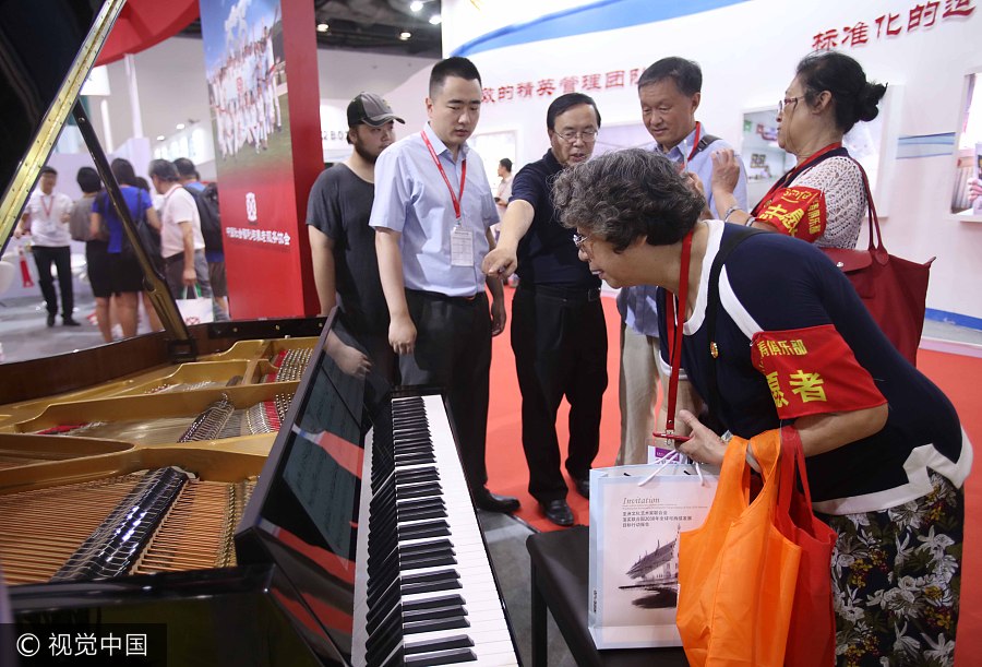 Una visitante mayor observaun piano inteligente en la VI Expo Internacional de Servicios para Personas Mayores de China en Beijing, el 4 de agosto de 2017. [Foto / VCG]
