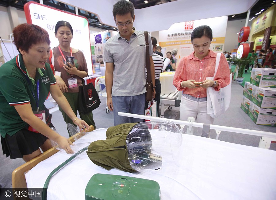 Una asistente muestra cómo se utiliza una máquina de cuidado inteligenteen la VI Expo Internacional de Servicios para Personas Mayores de China en Beijing, el 4 de agosto de 2017. [Foto / VCG]