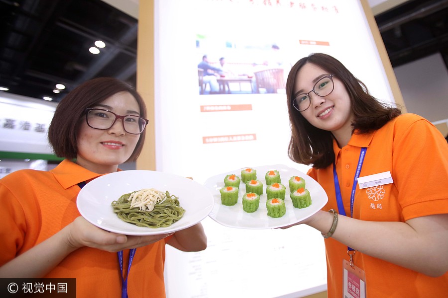 Dos trabajadoras muestran alimentos sanos para la tercera edad en la VI Expo Internacional de Servicios para Personas Mayores de China en Beijing, el 4 de agosto de 2017. [Foto / VCG]