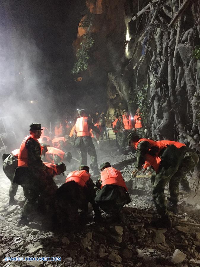 Rescatistas laboran en un sitio turístico afectado por un sismo, en la aldea de Zhangzha, condado de Jiuzhaigou, en la provincia de Sichuan, en el suroeste de China, el 9 de agosto de 2017. (Xinhua/Zheng Lei)