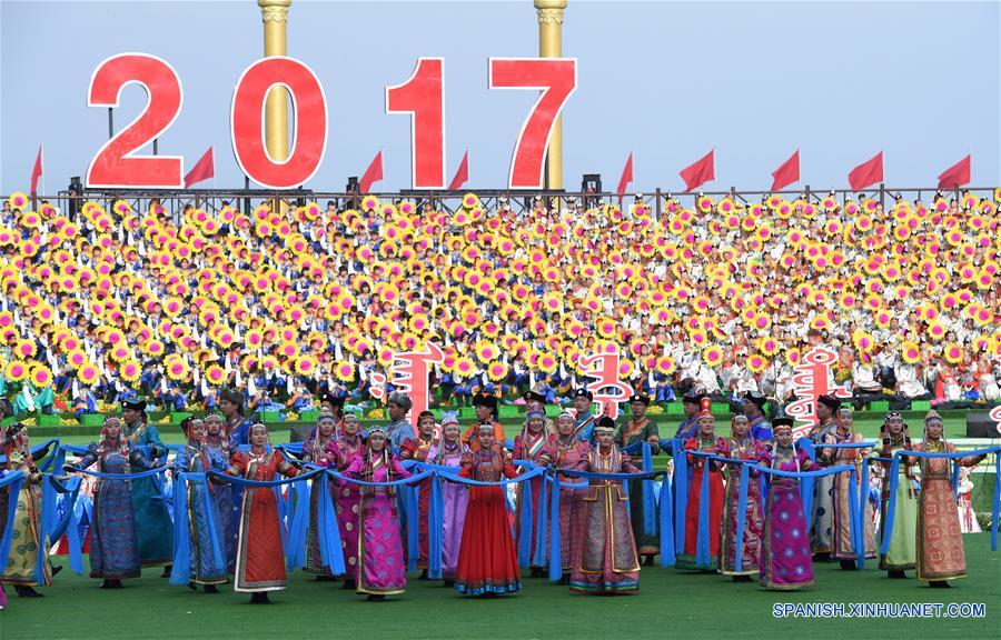 HOHHOT, agosto 8, 2017 (Xinhua) -- Bailarines actúan durante la celebración para conmemorar el 70 aniversario de la Región Autónoma de Mongolia Interior, en Hohhot, en la Región Autónoma de Mongolia Interior, en el norte de China, el 8 de agosto de 2017. (Xinhua/Zhang Ling)