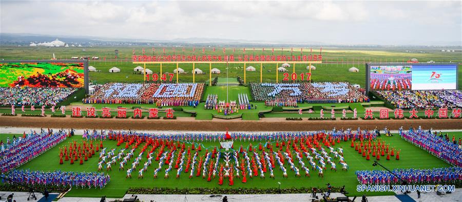HOHHOT, agosto 8, 2017 (Xinhua) -- Bailarines actúan durante la celebración para conmemorar el 70 aniversario de la Región Autónoma de Mongolia Interior, en Hohhot, en la Región Autónoma de Mongolia Interior, en el norte de China, el 8 de agosto de 2017. (Xinhua/Lian Zhen)