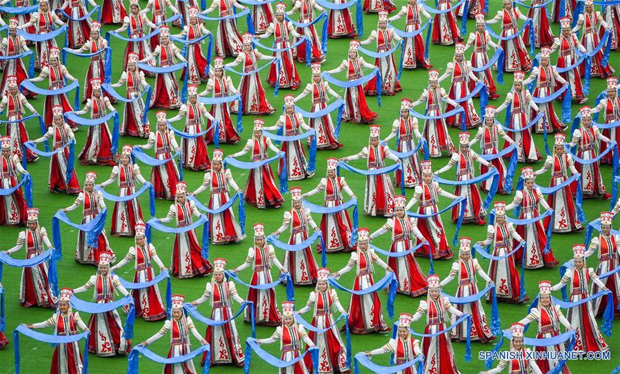 HOHHOT, agosto 8, 2017 (Xinhua) -- Bailarinas actúan durante la celebración para conmemorar el 70 aniversario de la Región Autónoma de Mongolia Interior, en Hohhot, en la Región Autónoma de Mongolia Interior, en el norte de China, el 8 de agosto de 2017. (Xinhua/Lian Zhen)