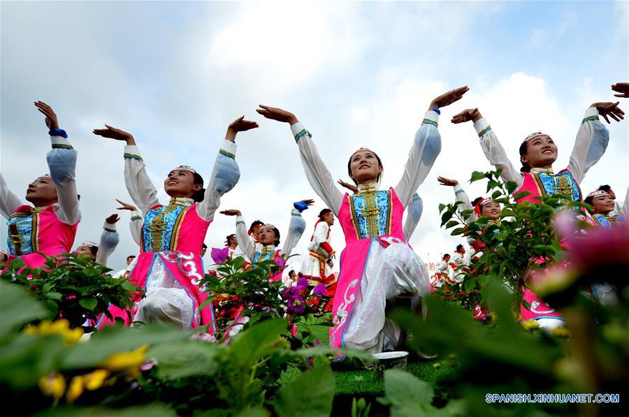 HOHHOT, agosto 8, 2017 (Xinhua) -- Bailarinas actúan durante la celebración para conmemorar el 70 aniversario de la Región Autónoma de Mongolia Interior, en Hohhot, en la Región Autónoma de Mongolia Interior, en el norte de China, el 8 de agosto de 2017. (Xinhua/Ren Junchuan)