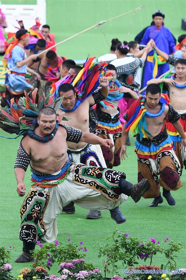 HOHHOT, agosto 8, 2017 (Xinhua) -- Luchadores actúan durante la celebración para conmemorar el 70 aniversario de la Región Autónoma de Mongolia Interior, en Hohhot, en la Región Autónoma de Mongolia Interior, en el norte de China, el 8 de agosto de 2017. (Xinhua/Zhang Ling)