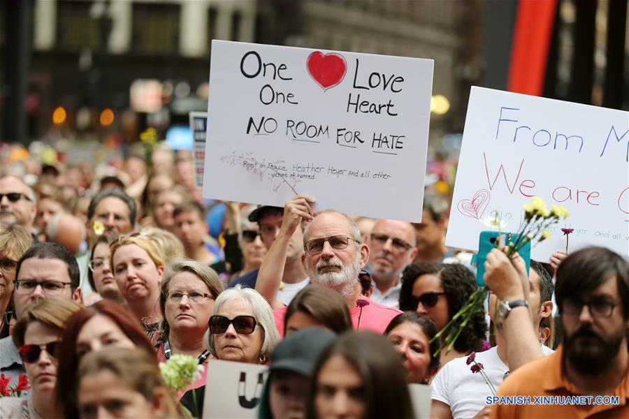 CHICAGO, 14 ago (Xinhua) -- Cientos de personas participaron el domingo en una vigilia en la plaza Federal del centro de Chicago en memoria de las víctimas de la violencia desatada durante el fin de semana en la ciudad de Charlottesville, en el estado de Virginia.