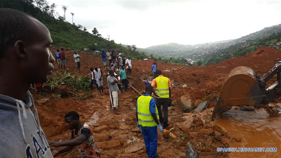 Rescatistas trabajan en el sitio donde ocurrió un desprendimiento de tierra, en Freetown, Sierra Leona, el 14 de agosto de 2017. Al menos 286 personas han muerto tras un deslizamiento de tierra a las afueras de Freetown, capital de Sierra Leona, confirmó el martes Sinneh Kamara, responsable del depósito de cadáveres del Hospital Connaught. (Xinhua/Liu Yu)