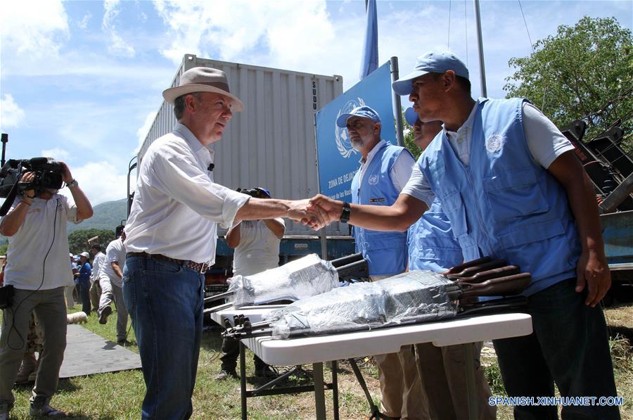 LA GUAJIRA, agosto 15, 2017 (Xinhua) -- Imagen cedida por la Presidencia de Colombia del presidente colombiano Juan Manuel Santos (i-frente), estrechando la mano con un representante de la Organización de las Naciones Unidas (ONU), durante el acto que marca la salida del último contenedor de armas de las Fuerzas Armadas Revolucionarias de Colombia (FARC) en la zona veredal de Pondores en el municipio de Fonseca, departamento de La Guajira, en el norte de Colombia, el 15 de agosto de 2017. El presidente Juan Manuel Santos, presenció el martes la salida del último de los contenedores de la ONU con armas de las FARC en el norte del país. El mandatario verificó el acto en la zona veredal de Pondores en el municipio de Fonseca en el departamento de La Guajira, que calificó como "el último suspiro del conflicto" armado que duró 53 a?os entre el Estado colombiano y las ahora extintas FARC. (Xinhua/Nelson Cárdenas/Presidencia de Colombia)