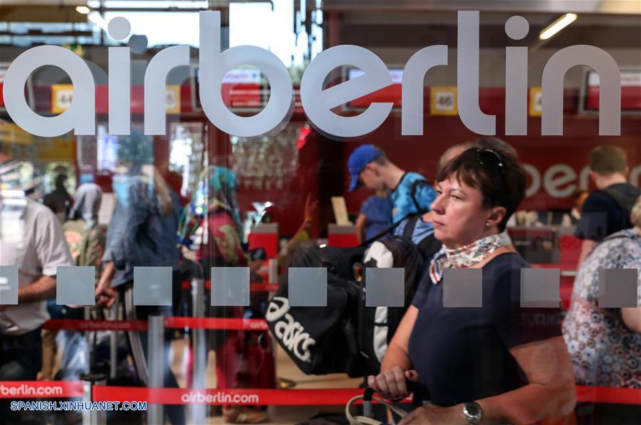 Pasajeros esperan para registrase en el mostrador de Air Berlin en el Aeropuerto Internacional Tegel, en Berlín, Alemania, el 15 de agosto de 2017. (Xinhua/Shan Yuqi)