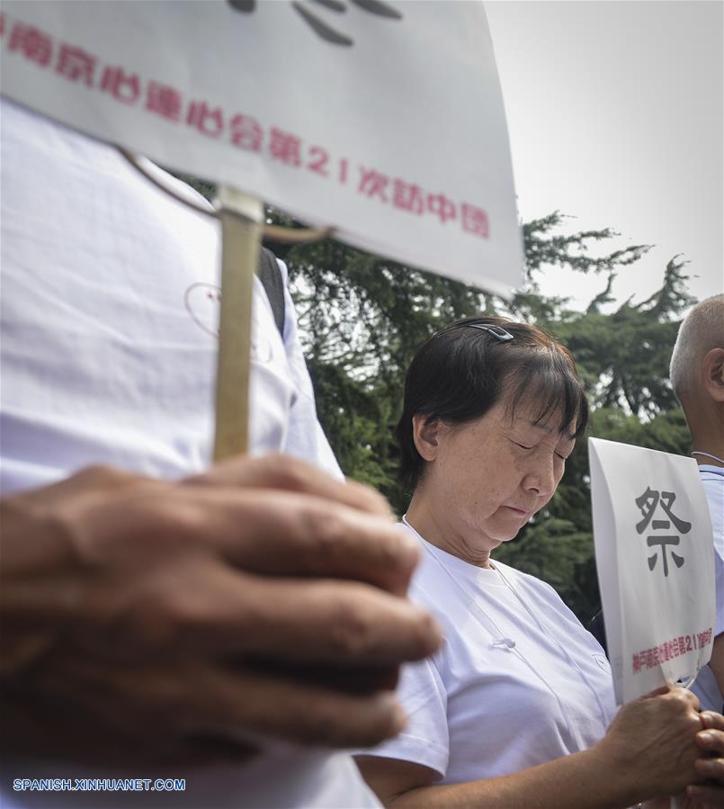 Integrantes de una Organización No Gubernamental anti-guerra con base en Kobe, Japón, asisten a la asamblea por la paz, en el Salón Memorial de las Víctimas de la Masacre de Nanjing, en Nanjing, capital de la provincia de Jiangsu, en el este de China, el 15 de agosto de 2017. Representantes de China, Japón, Pakistán, Bangladesh, Jordania, entre otros, asistieron al evento en el marco del 72 aniversario de la rendición incondicional de Japón en la Segunda Guerra Mundial.(Xinhua/Ji Chunpeng)