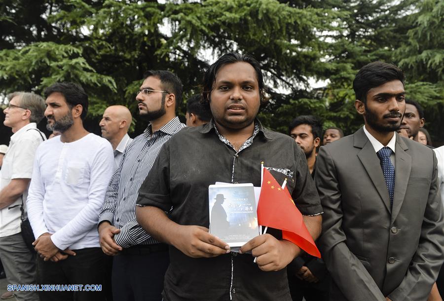 Estudiantes extranjeros asisten a la asamblea por la paz, en el Salón Memorial de las Víctimas de la Masacre de Nanjing, en Nanjing, capital de la provincia de Jiangsu, en el este de China, el 15 de agosto de 2017. Representantes de China, Japón, Pakistán, Bangladesh, Jordania, entre otros, asistieron al evento en el marco del 72 aniversario de la rendición incondicional de Japón en la Segunda Guerra Mundial. (Xinhua/Ji Chunpeng)