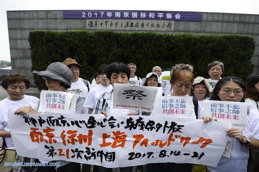 Integrantes de una Organización No Gubernamental anti-guerra con base en Kobe, Japón, asisten a la asamblea por la paz, en el Salón Memorial de las Víctimas de la Masacre de Nanjing, en Nanjing, capital de la provincia de Jiangsu, en el este de China, el 15 de agosto de 2017. Representantes de China, Japón, Pakistán, Bangladesh, Jordania, entre otros, asistieron al evento en el marco del 72 aniversario de la rendición incondicional de Japón en la Segunda Guerra Mundial. (Xinhua/Ji Chunpeng)