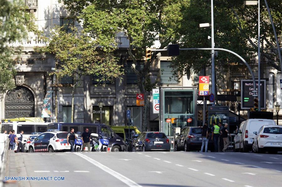 Miembros de los cuerpos de seguridad trabajan en el lugar donde se registró el atropellamiento de personas por parte de una furgoneta, en Las Ramblas de Barcelona, Espa?a, el 17 de agosto de 2017. (Xinhua/Albert Salamé/NOTIMEX)