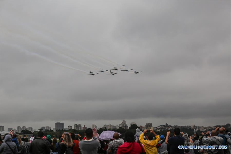 SAO PAULO, agosto 20, 2017 (Xinhua) -- Residentes observan un escuadrón acrobático de la Fuerza Aérea Brasile?a durante el evento anual "Domingo Aéreo", en el Aeropuerto Campo de Marte en Sao Paulo, Brasil, el 20 de agosto de 2017. De acuerdo con información de la prensa local, el "Domingo Aéreo" se realiza anualmente en Sao Paulo para promover la integración entre los residentes y las fuerzas armadas, y se realizan distintas acrobacias aéreas y en tierra. (Xinhua/Rahel Patrasso)