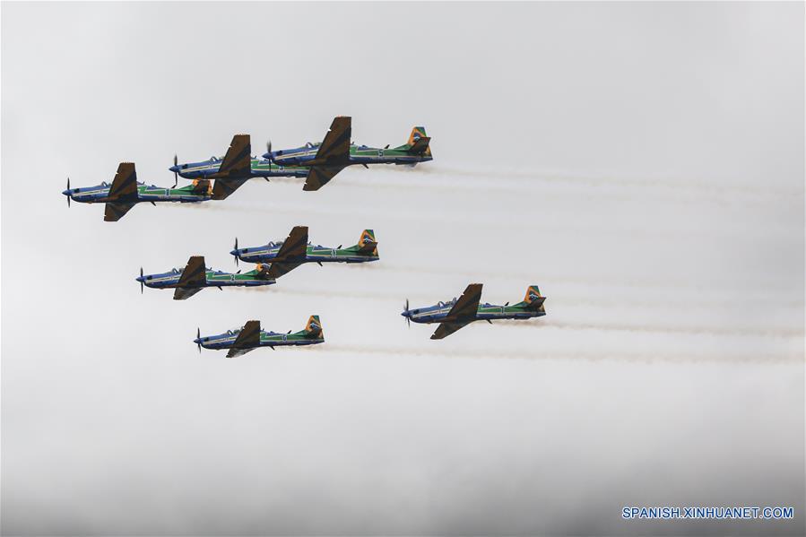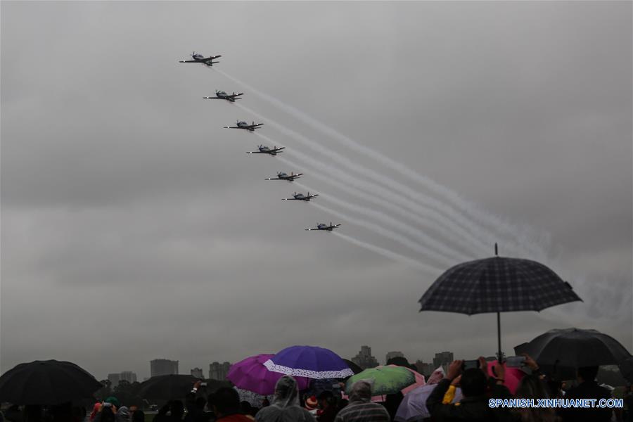 SAO PAULO, agosto 20, 2017 (Xinhua) -- Un escuadrón acrobático de la Fuerza Aérea Brasile?a participa durante el evento anual "Domingo Aéreo", en el Aeropuerto Campo de Marte en Sao Paulo, Brasil, el 20 de agosto de 2017. De acuerdo con información de la prensa local, el "Domingo Aéreo" se realiza anualmente en Sao Paulo para promover la integración entre los residentes y las fuerzas armadas, y se realizan distintas acrobacias aéreas y en tierra. (Xinhua/Rahel Patrasso)